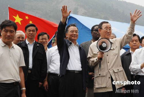 5月24日,中國國務院總理溫家寶與聯合國秘書長潘基文在汶川重災區會見,并向他介紹汶川地震災區情況。溫家寶表示,感謝全球華人對地震災情的關心和援助。聯合國秘書長潘基文是當日從泰國飛往中國四川映秀鎮慰問災情的。中新社發 陳文 攝