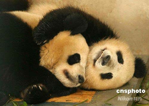 5月26日,來自四川臥龍的8只奧運大熊貓在北京動物園開始了新的生活。此次進京的8只奧運大熊貓,是今年3月21日啟動的“2008四川臥龍大熊貓奧運北京行”投票評選活動中,由廣大網民從16只大熊貓里選出來的。這8只熊貓,雌雄各半,現在的年齡都在1歲9個月之間,屬亞成體,正是最活潑可愛的年華。圖為兩只大熊貓在互相依偎著休息。 中新社發 富田 攝