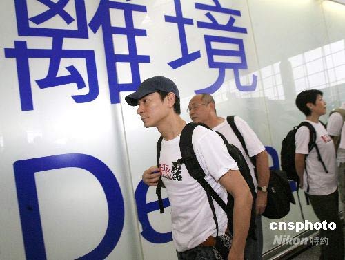 五月二十八日,出發去四川地震災區探訪的香港演藝界“5·12關愛行動”首批藝人在香港國際機場接受媒體采訪。劉德華、鄭秀文、容祖兒等十多位藝人將在四川地震災區慰問四天,將服從當地安排去探望災區孤兒并參加三十日四川的賑災演出等工作。中新社發 王麗南 攝