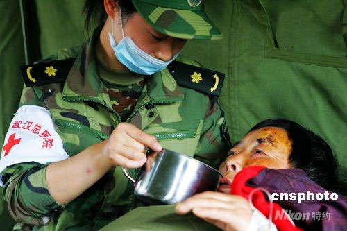 廣州軍區武漢總醫院護士彭葉葉,在汶川為從廢墟中救出來的劉華書老人喂藥。中新社發 徐維鴻 攝