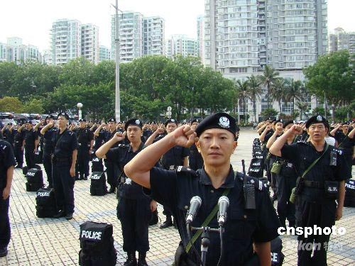 5月31日上午8時,海口200名特警南港碼頭登船出征,奔赴四川抗震救災。此次出征特警要到達四川德陽市,為期3個月,主要職責是協助當地公安機關巡邏防控、打擊違法犯罪活動、恢復110、119、122接處警和服務災民工作。中新社發 付美斌 攝