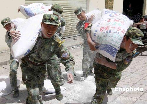 鐵軍救災物資運輸隊的車隊將救災物資送達理縣藏、羌族居住的高原山寨。中新社發 曾憲平 攝