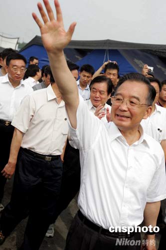 6月6日,國務(wù)院總理溫家寶到四川綿陽涪城區(qū)疏散安置點慰問受災(zāi)民眾。 中新社發(fā) 杜洋 攝