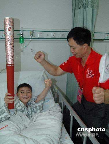 火炬手自發趕到廣西醫科大學附屬醫院,看望在這里治療的四川地震災區傷員,并讓他們在病床上與“祥云”親密接觸,了卻看奧運圣火傳遞的心愿。中新社發 蔣雪林 攝