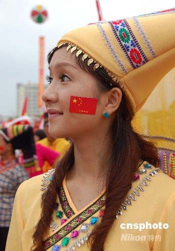 圖為一位壯族姑娘臉上貼著中國國旗圖案歡迎圣火。中新社發 劉萬強 攝