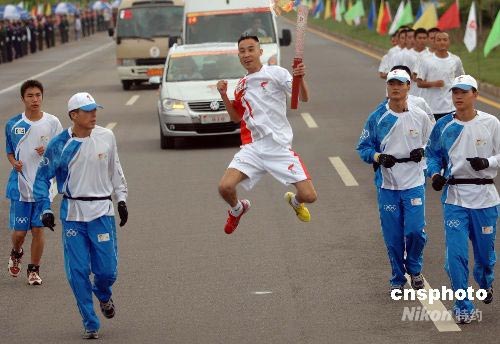 6月10日,奧運圣火在云南麗江傳遞,53號火炬手馬亮武傳遞火炬時騰空歡愉。中新社發 廖攀 攝