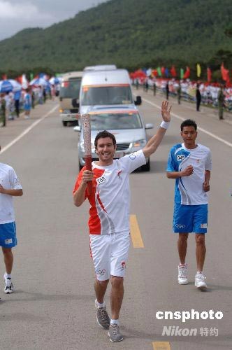 6月10日,奧運圣火在云南麗江傳遞,圖為168號火炬手法國人尼爾·格雷高(音譯)正在傳遞火炬。中新社發 廖攀 攝