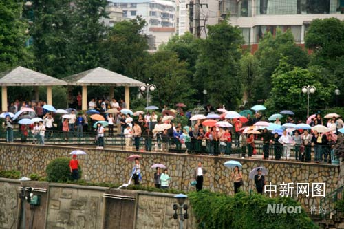 圖:貴陽市民冒雨觀看火炬?zhèn)鬟f