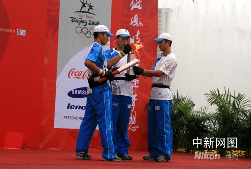 6月12日,北京奧運(yùn)火炬在貴陽(yáng)傳遞。圖為圣火護(hù)衛(wèi)隊(duì)員從火種燈內(nèi)取火,點(diǎn)燃第一支火炬。記者周兆軍攝