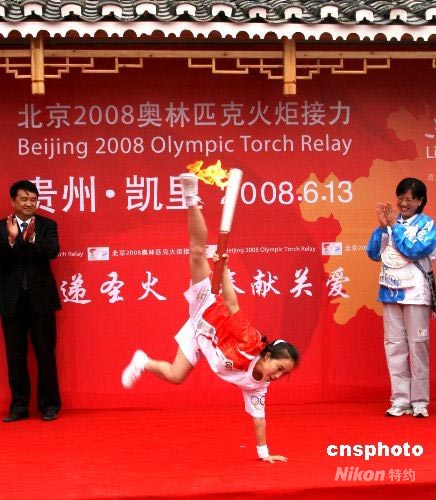 6月13日,奧運(yùn)火炬在貴州省黔東南苗族侗族自治洲傳遞,第一棒火炬手、體操運(yùn)動員林麗接過火炬后,做起了精彩的體操動作,引得現(xiàn)場一片喝彩。 中新社發(fā) 周兆軍 攝