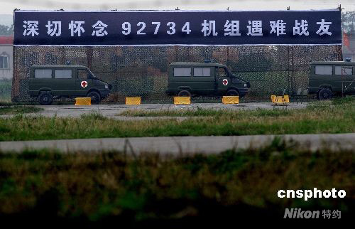 陸航團官兵在鳳凰山機場內懸掛“深切懷念92734機組遇難戰友”大型黑底白字條幅,追憶戰友。中新社發 劉新 攝