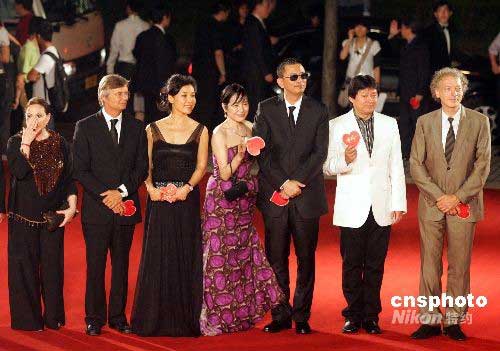 圖為金爵獎國際評委亮相,他們是德國制片人烏里希、中國導演霍建起、中國香港導演王家衛、日本明星桃井熏、著名演員陳沖、丹麥導演比爾和以色列女演員吉拉(右起)。中新社發 潘索菲 攝
