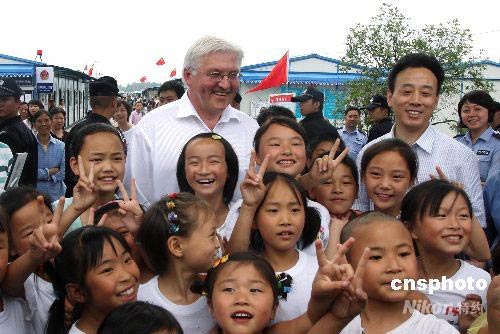 德國副總理兼外長施泰因邁爾來到四川地震災區都江堰市“勤儉人家”安置點,看望安置點的居民和帳篷學校的孩子們。圖為施泰因邁爾和孩子們合影留念。中新社發 黃榮 攝