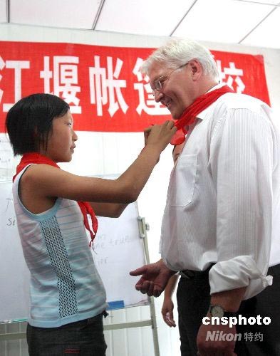 四川地震災(zāi)區(qū)孩子為德國外長系上紅領(lǐng)巾