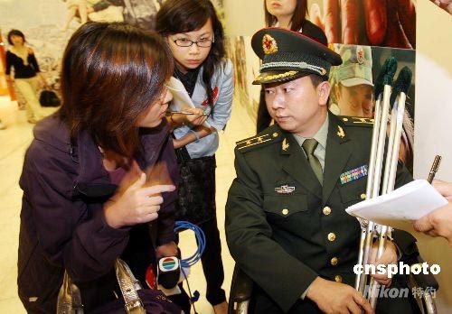 “大愛無疆—汶川大地震抗震救災圖片展”在香港展覽中心展出,大會邀請到抗震救災第一線的英雄成都軍區的鐘良軍在開幕式上作報告。中新社發 洪少葵 攝
