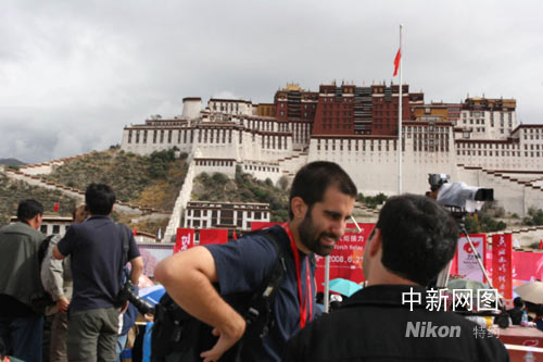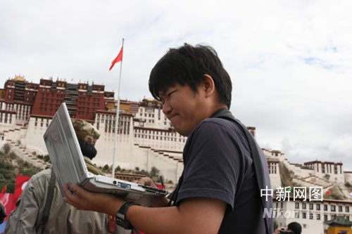 圖為奧運火炬西藏傳遞路上緊張工作的國內外記者。中新社記者 柳俊武 攝