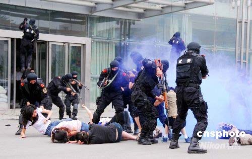 6月30日,山東省反恐怖工作協調小組在濟南成功舉行了“泰山2008”反恐演習。“泰山2008”反恐演習以北京奧運會期間可能發生的恐怖襲擊事件為背景,以有效防范和正確處置為課題,主要目的是檢驗和提升山東省城市防范處置恐怖襲擊事件的應急反應能力、組織指揮能力和綜合保障能力。這次演習是山東省第一次公安各警種與武警、衛生、市政等反恐應急力量協同作戰的合成演習,是第一次以導調推演方式進行的檢驗性演習,也是第一次通過全省公安視音頻系統同步傳輸的反恐演習。中新社發 陳 進 攝