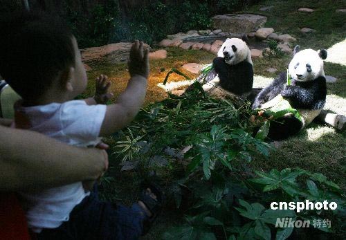 七月一日,游客在香港海洋公園看望在此安家一周年的樂樂、盈盈。中新社發 武仲林 攝