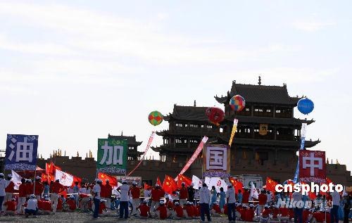 7月6日,北京奧運火炬穿越“天下第一雄關”嘉峪關,現(xiàn)場觀眾打出“中國加油”的標語。嘉峪關是明長城的西端起點,也是目前長城沿線保存最完整的一座雄關。中新社發(fā) 周兆軍 攝