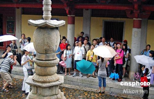 七月七日,參加海峽西岸二00八年臺胞青年夏令營的一百一十多名臺胞青年來到古城泉州,冒雨參觀建于唐朝開元年間、迄今已有一千二百多年歷史的開元寺。此次夏令營以“魅力海西、臺胞祖地”為主題,旨在讓兩岸青年在參觀歷史文化古跡、聆聽閩臺傳統(tǒng)文化講座、舉行聯(lián)歡活動(dòng)中增進(jìn)友誼和對福建的了解。中新社發(fā) 傅丹丹 攝