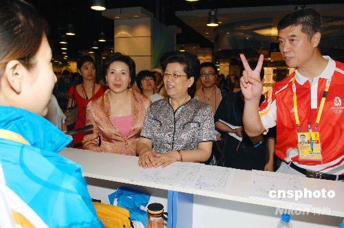 圖為全國(guó)人大常委會(huì)副委員長(zhǎng)、北京奧組委副主席陳至立參觀主新聞中心記者工作區(qū)。 中新社發(fā) 陳文 攝