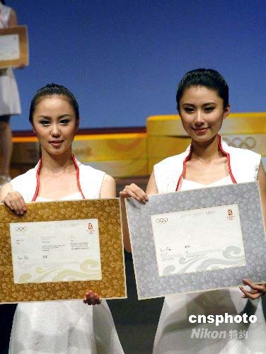 奧運(yùn)禮儀志愿者展示2008北京奧運(yùn)頒獎(jiǎng)證書。中新社發(fā) 王東明 攝