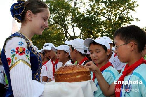圖為身穿民族服裝的俄羅斯少女手捧面包和鹽,用傳統禮儀歡迎來此療養的中國學生。中新社發 田冰 攝