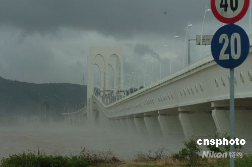 八月六日上午,受熱帶風暴“北冕”影響,澳門掛出八號風球,三座連接半島和離島的大橋橋面關閉,唯圖中西灣大橋的下層通道可供車輛使用。中新社發 畢永光 攝