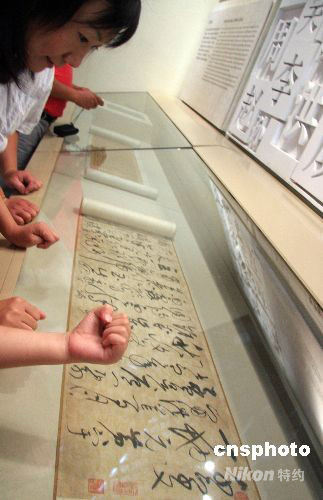 8月11日,觀眾在中國科技館新館內仔細欣賞中國古代一位皇帝——宋徽宗趙佶的書法作品真跡。趙佶雖然皇帝做得不怎么樣,卻以獨創的“瘦金體”書法和高超的工筆繪畫藝術,為中國書畫藝術發展作出重要貢獻。中新社發 孫自法 攝