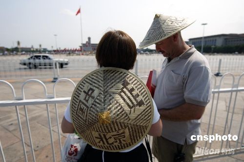 8月18日,北京天氣晴好,外國(guó)游客頭戴斗笠游北京。中新社發(fā) 王東明 攝