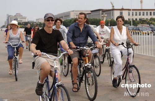 8月18日,北京晴空萬(wàn)里,外國(guó)游客集體騎自行車在北京街頭游玩。中新社發(fā) 王東明 攝