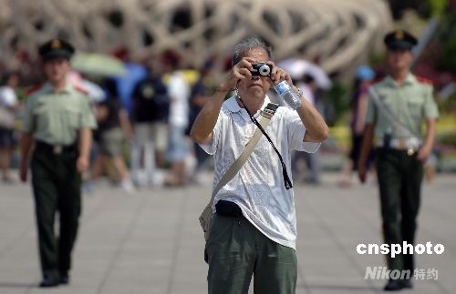 一老人在天安門廣場認真拍攝天安門城樓。中新社發 王東明 攝