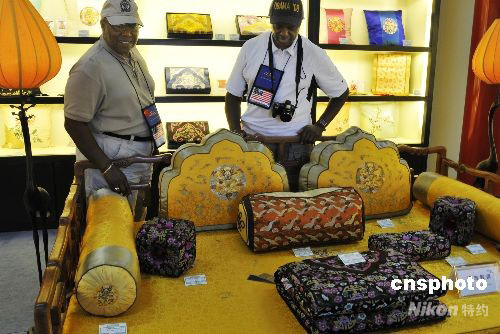 8月21日,北京故宮博物院的“皇家飾品”商店迎來(lái)了海內(nèi)外顧客。商店內(nèi)銷售的均為仿清朝宮廷風(fēng)格的各式靠墊、睡衣等絲綢錦緞手工制品。美國(guó)游客安東尼和查里對(duì)商店里清代皇家風(fēng)格的刺繡紋飾擺件情有獨(dú)鐘。中新社發(fā) 王宇婷 攝
