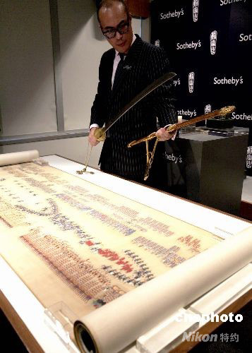 專家正在介紹珍稀乾隆御制《大閱第三圖 閱陣》手卷,及清乾隆御制金桃皮鞘“天字十七號”“寶騰”腰刀。中新社發 張勤 攝