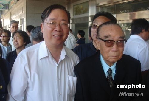 圖為90多歲高齡的中國前首任駐美大使柴澤民(右)和周恩來總理秘書羅青長之子(左)出席告別儀式。中新社發 韓凱 攝