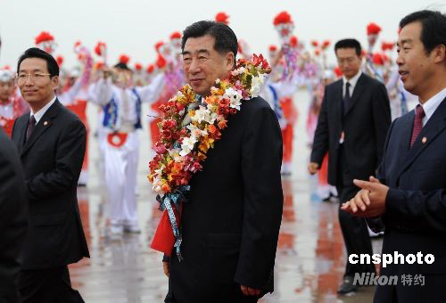圖為中共中央政治局委員、國務院副總理回良玉戴上寧夏民眾獻上的花環。中新社發 廖攀 攝