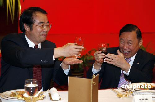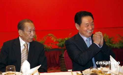 圖為國務院僑辦原主任、中國僑商投資企業協會名譽會長郭東坡(右)和東南亞知名僑領唐裕出席招待午宴。