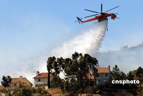 消防直升機從住宅上空瀉下消防用水。中新社發 張煒 攝