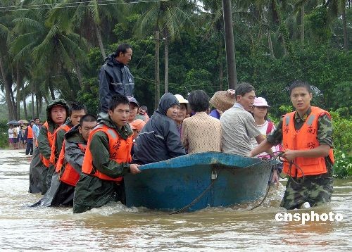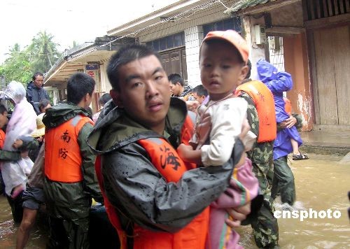 海南文昌遭受連續三天的暴雨襲擊,全縣多處遇險,其中兩名村民遇難。文昌部隊官兵全部出動,協助當地政府抗洪救災,轉移群眾,搬運物資。中新社發 蔣第二 攝