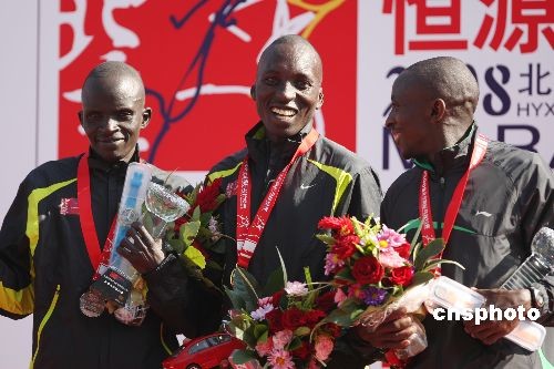 在男子全程馬拉松比賽中,肯尼亞選手本杰明奪得冠軍,他的隊友切里莫和西蒙分別獲得了亞軍和季軍。中新社發 盛佳鵬 攝
