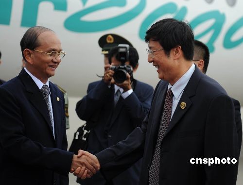 十月二十日,緬甸總理登盛飛抵廣西南寧,出席將于二十二日舉行的第五屆中國—東盟博覽會。他在南寧國際機場受到廣西官員的熱烈歡迎。中新社發 蔣雪林 攝