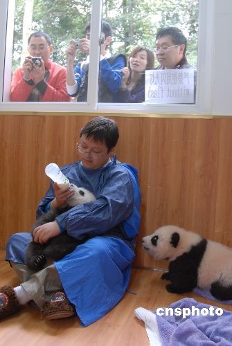 截至10月下旬,雅安碧峰峽基地生活著60余只大熊貓。圖為飼養(yǎng)員們給07年出生的熊貓幼仔喂食。
