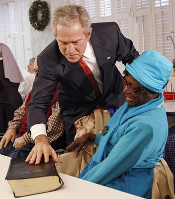 布什在參觀華盛頓的老年人慈善機構“窮人姐妹”時,好奇地看一位老年人的《圣經》。作者:旺仔
