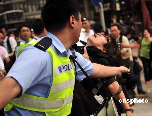 游行中部分人情緒激動,亦有人途中暈倒。中新社發 譚達明 攝