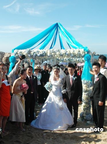 11月6日,2008北京奧運會體操“全能王”在海南三亞著名的天涯海角景區的愛情廣場的沙灘上舉行盛大浪漫的婚禮,與新娘楊云經過8年的愛情長跑,終于走進婚姻的殿堂。楊威和新娘楊云登上熱氣球,演繹空中浪漫。中新社發 尹海明 攝