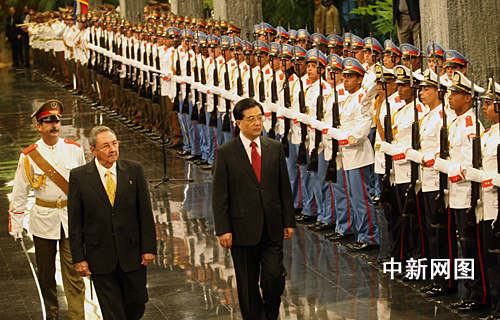 古巴國務委員會主席勞爾·卡斯特羅,十八日在革命宮舉行儀式,歡迎中國國家主席胡錦濤對古巴進行國事訪問。記者 齊彬攝