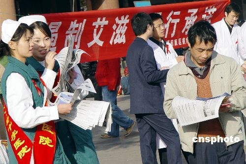 兩名醫護人員在鄭州火車站前向過往旅客發放防艾資料。