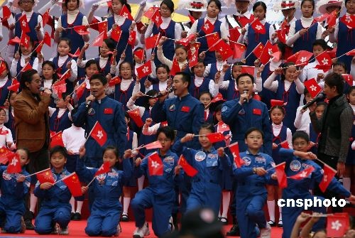 “神舟七號” 航天員翟志剛、劉伯明和景海鵬與香港藝人譚詠麟、李克勤合唱《龍的傳人》。中新社發 武仲林 攝