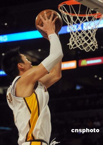 當地時間十二月七日晚,NBA洛杉磯湖人隊在主場以一百零五比九十二輕取雄鹿隊,中國球員孫悅首度在NBA常規賽上登場,共取得四分。圖為孫悅上籃得分。中新社發 張煒 攝