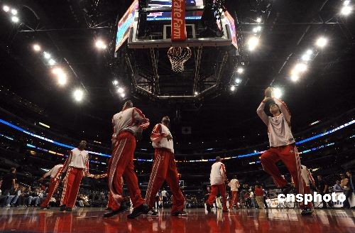圖為火箭隊賽前熱身。中新社發 張煒 攝